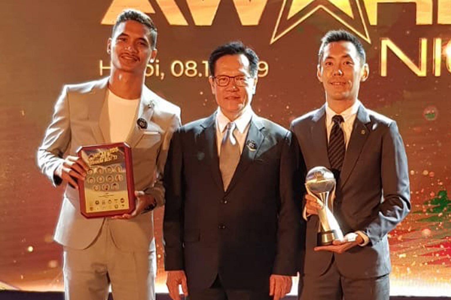 FAS president Lim Kia Tong (centre) with Safuwan Baharudin (left) and Ronnie Koh at the AFF Awards in Hanoi, on Nov 8, 2019.