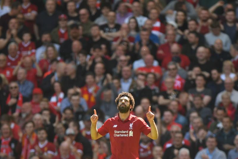 Liverpool's Egyptian midfielder Mohamed Salah celebrates after scoring during the English Premier League football match between Liverpool and Brighton and Hove Albion at Anfield in Liverpool, north west England on May 13, 2018.
