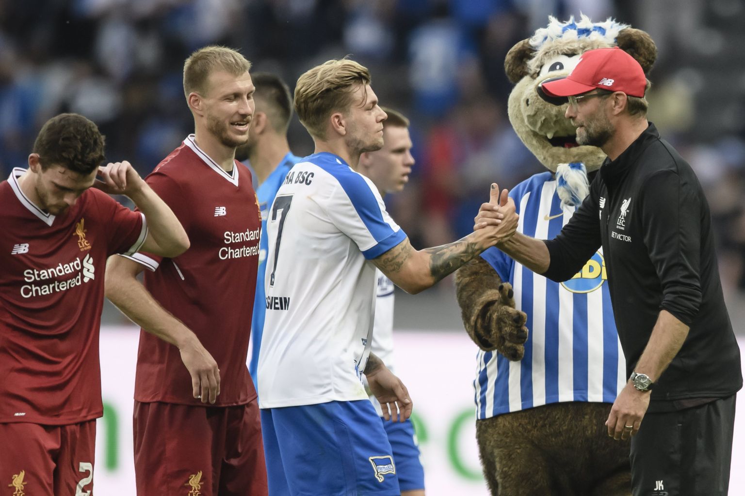 Klopp, though, was all smiles upon his return to Berlin this weekend, even sharing an embrace with Hertha's mascot ahead of the game.