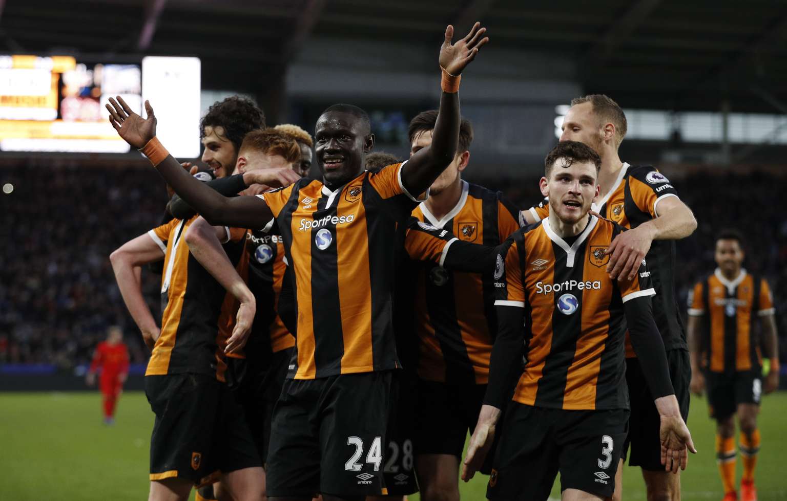 Hull City's Oumar Niasse celebrates scoring their second goal with teammates.