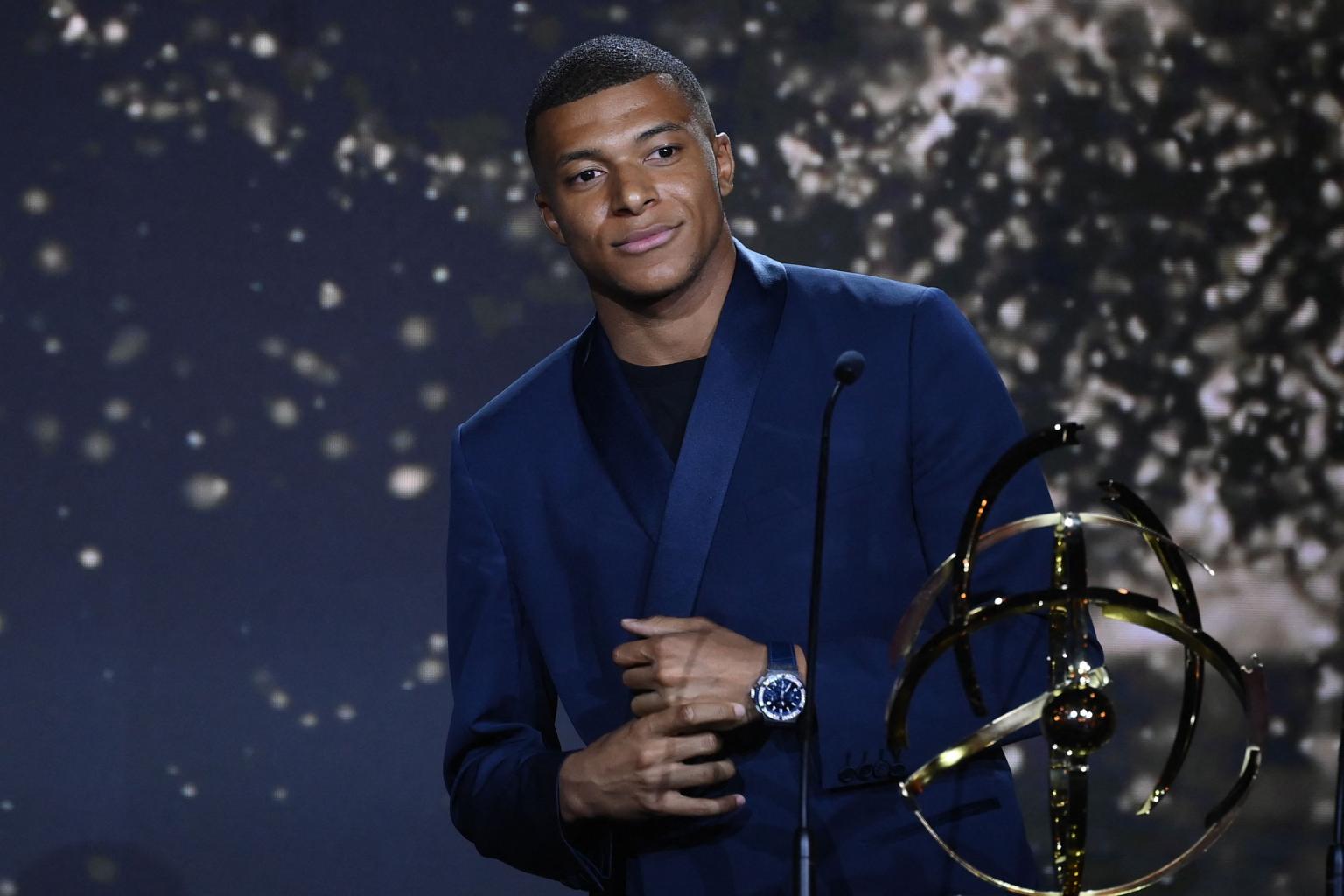 Paris Saint-Germain striker Kylian Mbappe receiving the Best Ligue 1 Player award in Paris on May 15, 2022.
