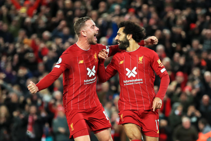 Liverpool's Mohamed Salah (right) celebrates scoring his side's second goal with Jordan Henderson during the English Premier League soccer match between Liverpool and Tottenham Hotspur at Anfield stadium on Oct 27, 2019.