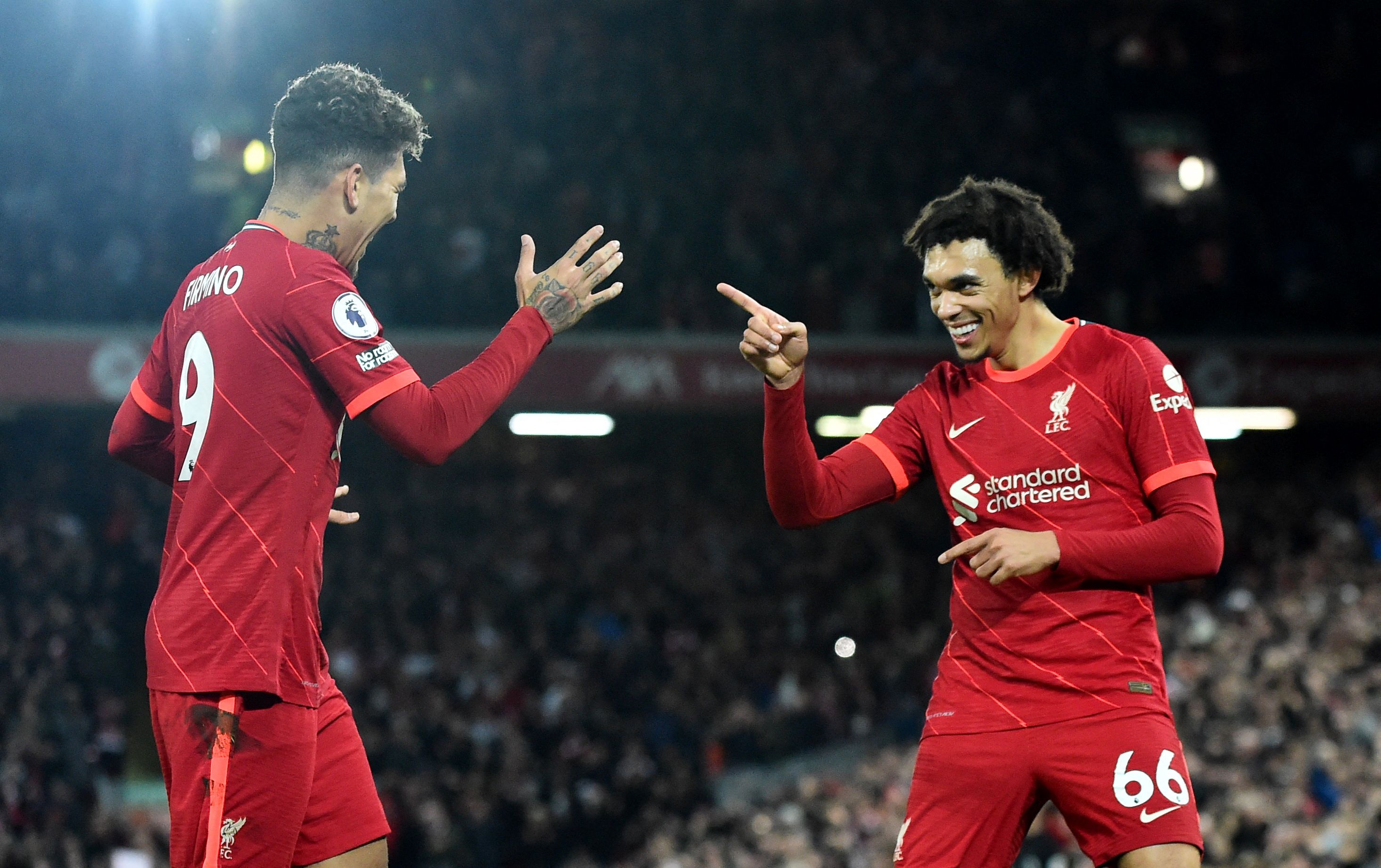 Liverpool's Trent Alexander-Arnold celebrates scoring their third goal with Roberto Firmino.