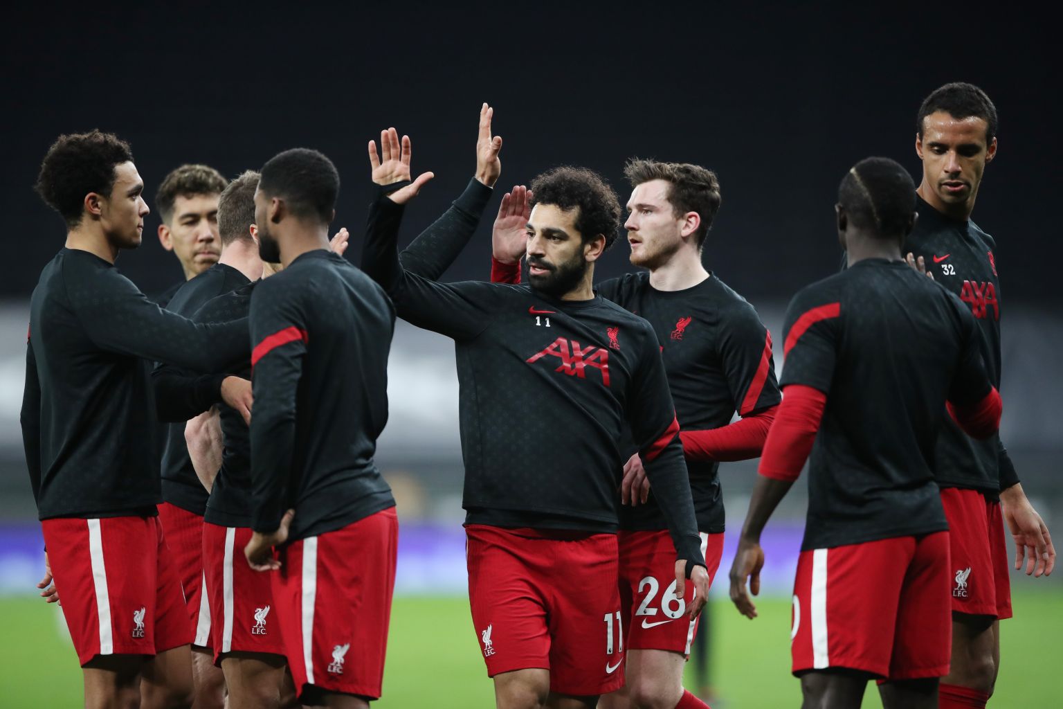 Liverpool's Mohamed Salah and teammates during the warm up before a match against Tottenham Hotspur.
