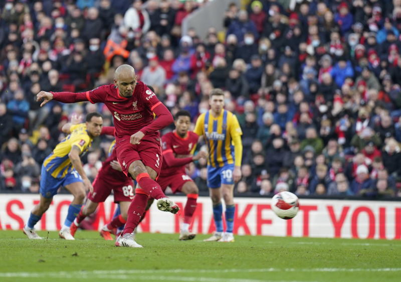 Fabinho scores the 2-1 lead from the penalty spot in Liverpool, on Jan 9, 2022.
