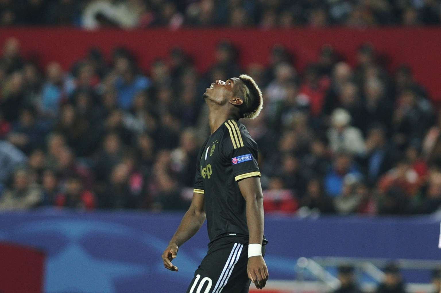 Juventus' French midfielder Paul Pogba reacts after missing a goal opportunity.