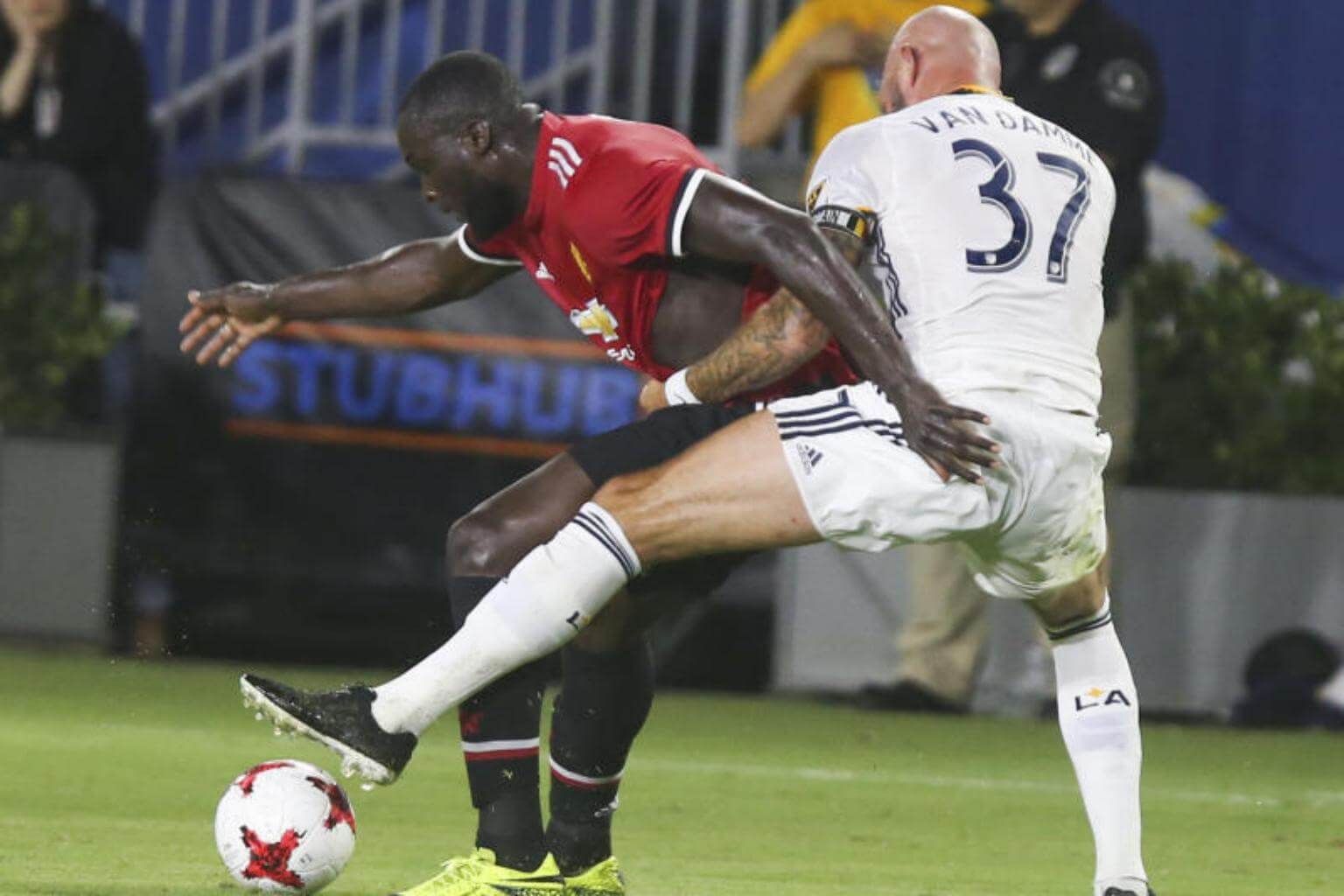 Manchester United Romelu Lukaku (left) and Los Angeles Galaxy Jelle Van Damme battle for the ball during the second half of a national friendly soccer game at StubHub Center on July 15, 2017 in Carson, California.