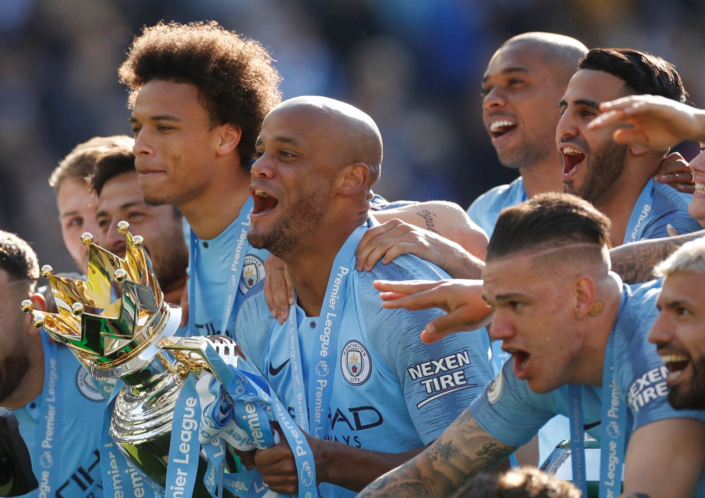 Manchester City's Vincent Kompany lifts the trophy as the team celebrates winning the Premier League in 2019.