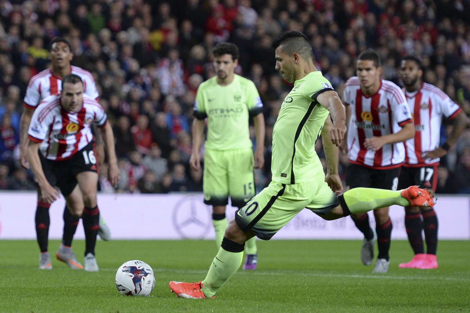 They were 4-0 up inside 36 minutes through a ninth-minute Sergio Aguero penalty, De Bruyne's second goal for the club, an own goal by Sunderland goalkeeper Vito Mannone and a neat finish by Raheem Sterling.
