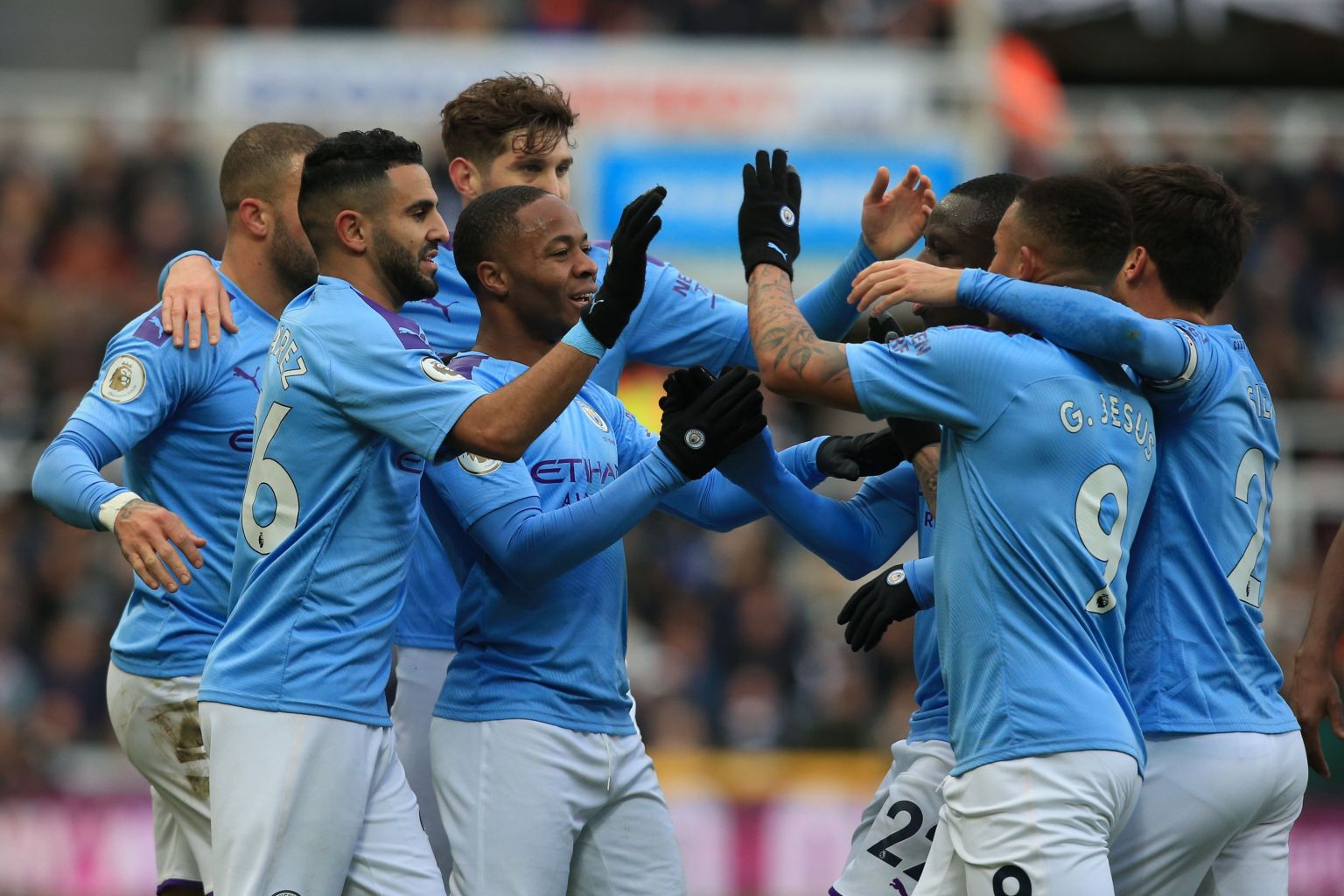 Manchester City's Raheem Sterling (third left) celebrates scoring a goal with team mates.