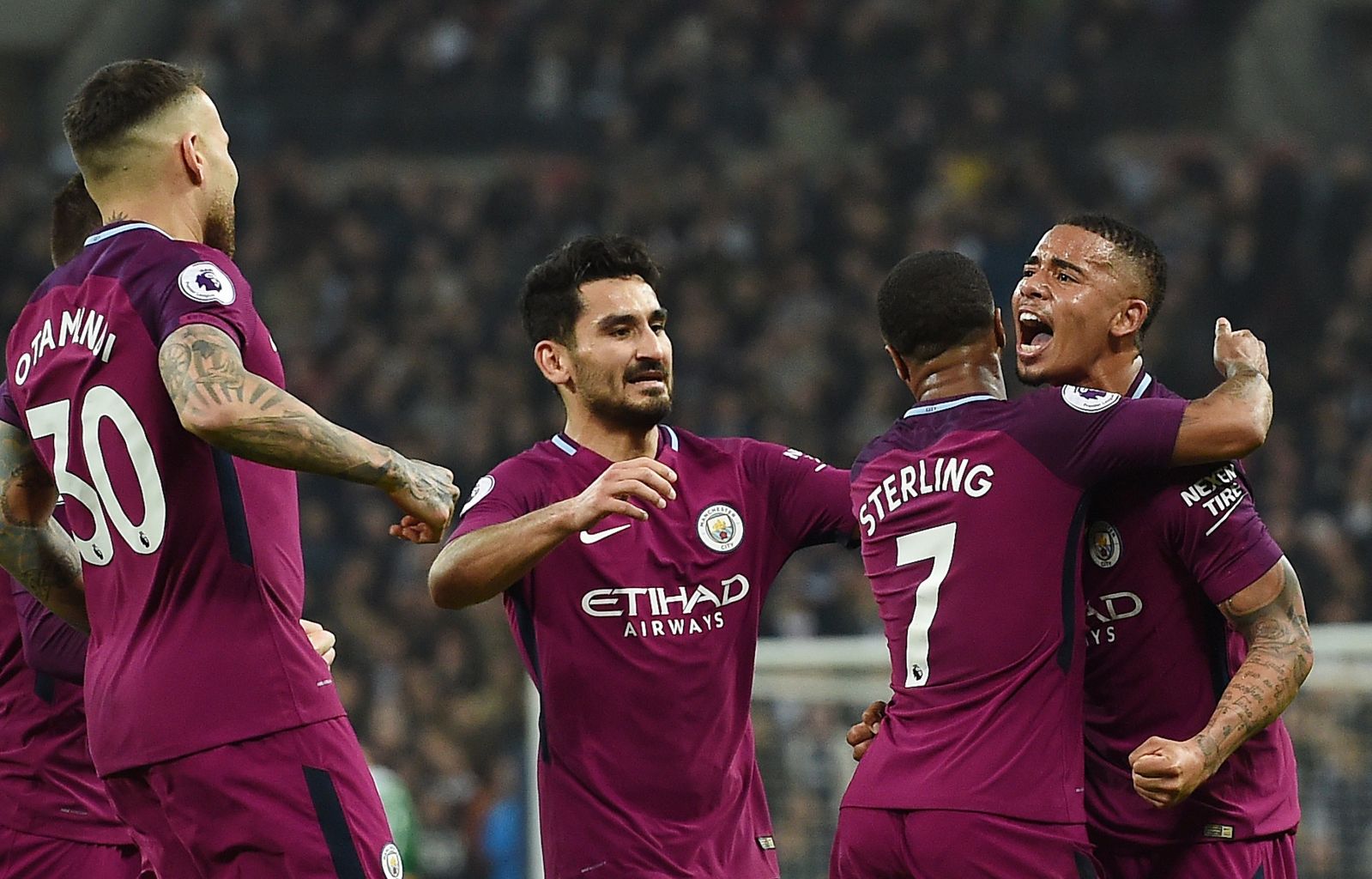 City's Raheem Sterling (second right) celebrates with team mate Jesus (right) after scoring his side's third goal.