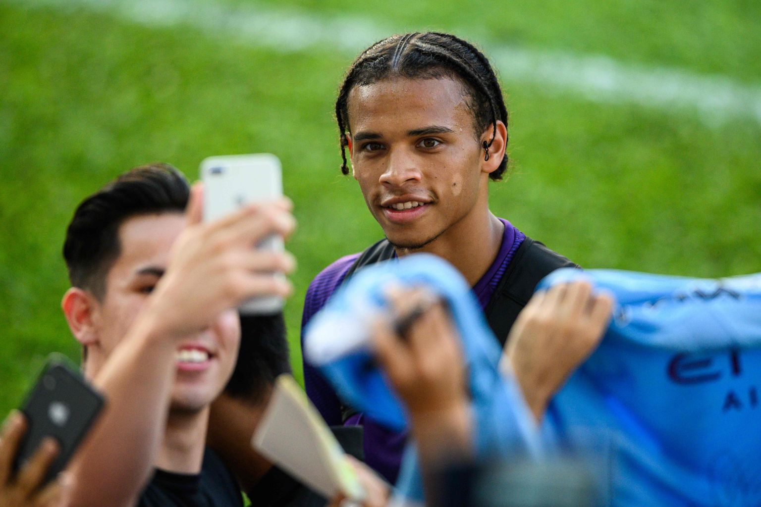 Sane (centre) takes a selfie with a fan after a team training session in Hong Kong in July 2019.