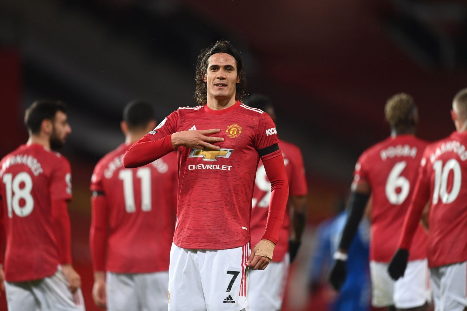 Manchester United's Edinson Cavani celebrates a Premier League goal against Everton.