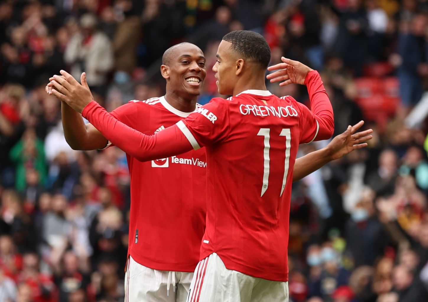Manchester United's Mason Greenwood celebrates scoring their first goal with Anthony Martial.