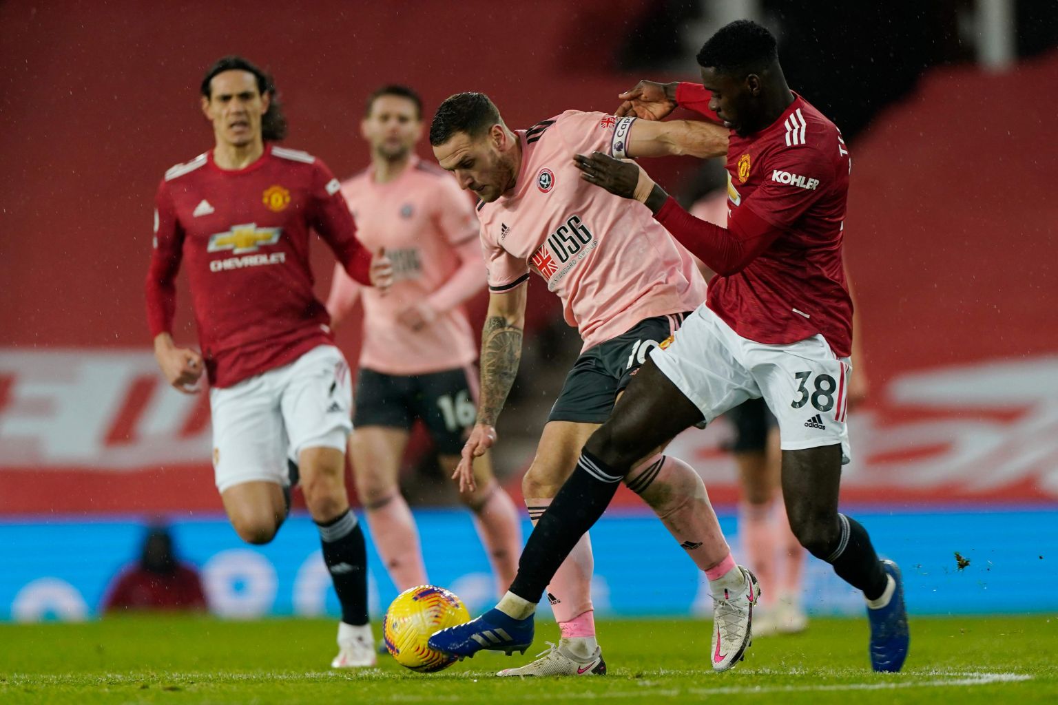 Manchester United defender Axel Tuanzebe (right) vies for the ball with Sheffield United's Billy Sharp.