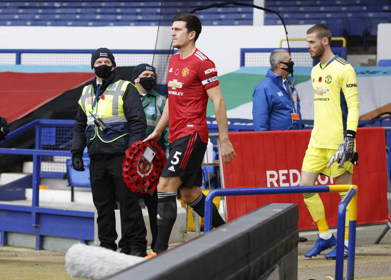 Manchester United's Harry Maguire leads his team out before the match against Everton at Goodison Park on Nov 7, 2020.
