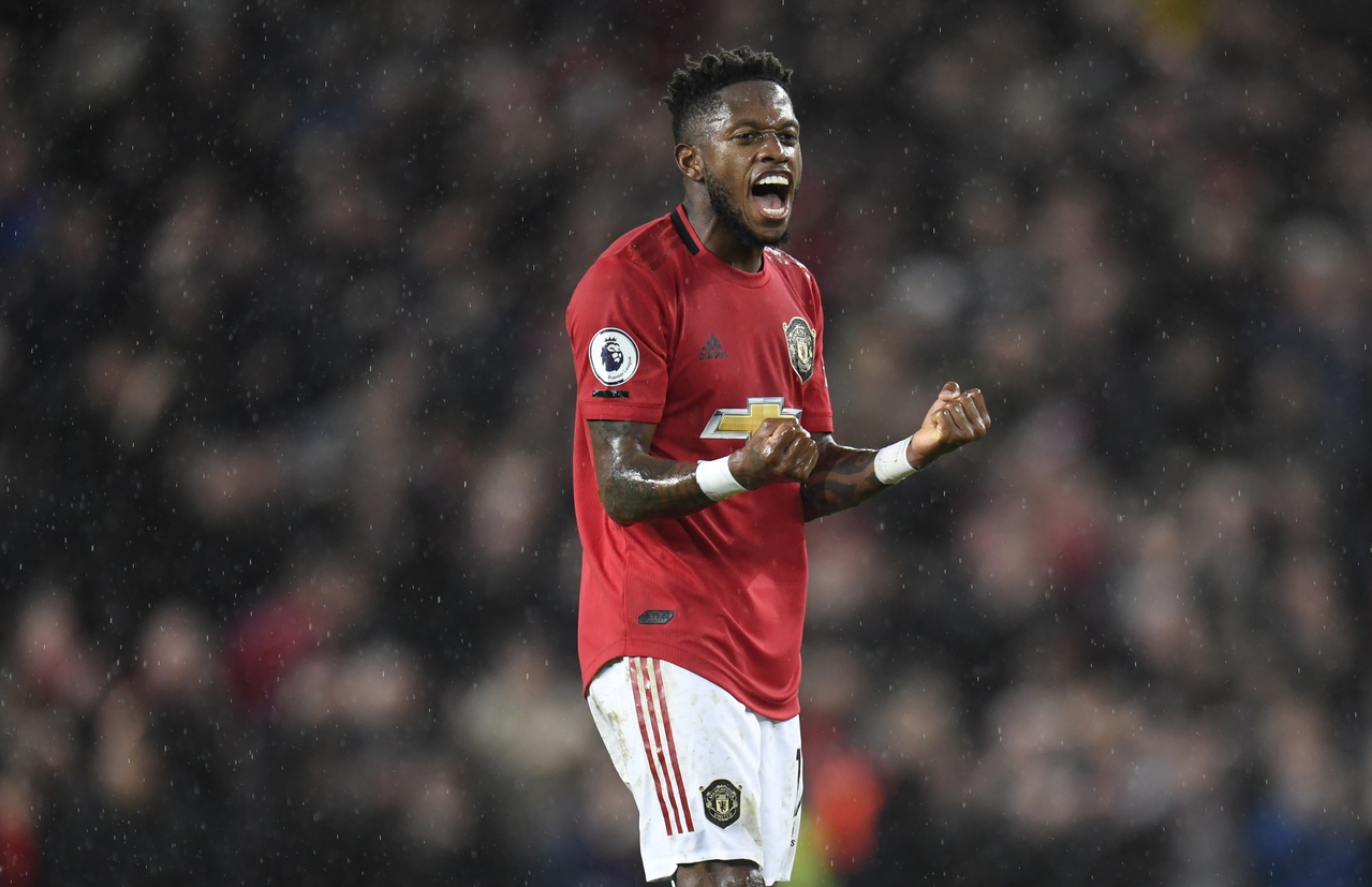 Fred of Manchester United celebrates with supporters at the end of the English Premier League match between Manchester United and Manchester City held at Old Trafford in Manchester, Britain, on March 8, 2020.