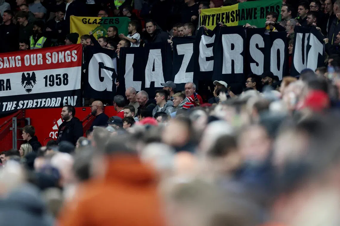 Manchester United fans display banners before a match in protest at the Glazer family’s ownership of the club.