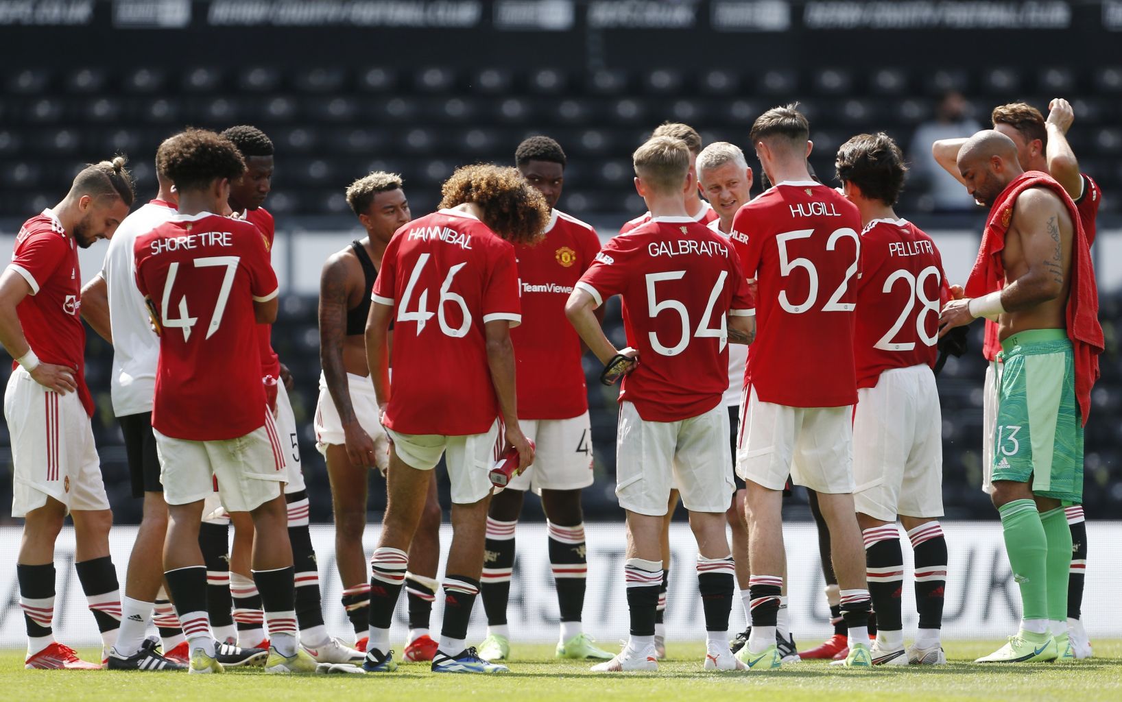 Manchester United manager Ole Gunnar Solskjaer speaks with his players after a friendly against Derby County on July 18, 2021.
