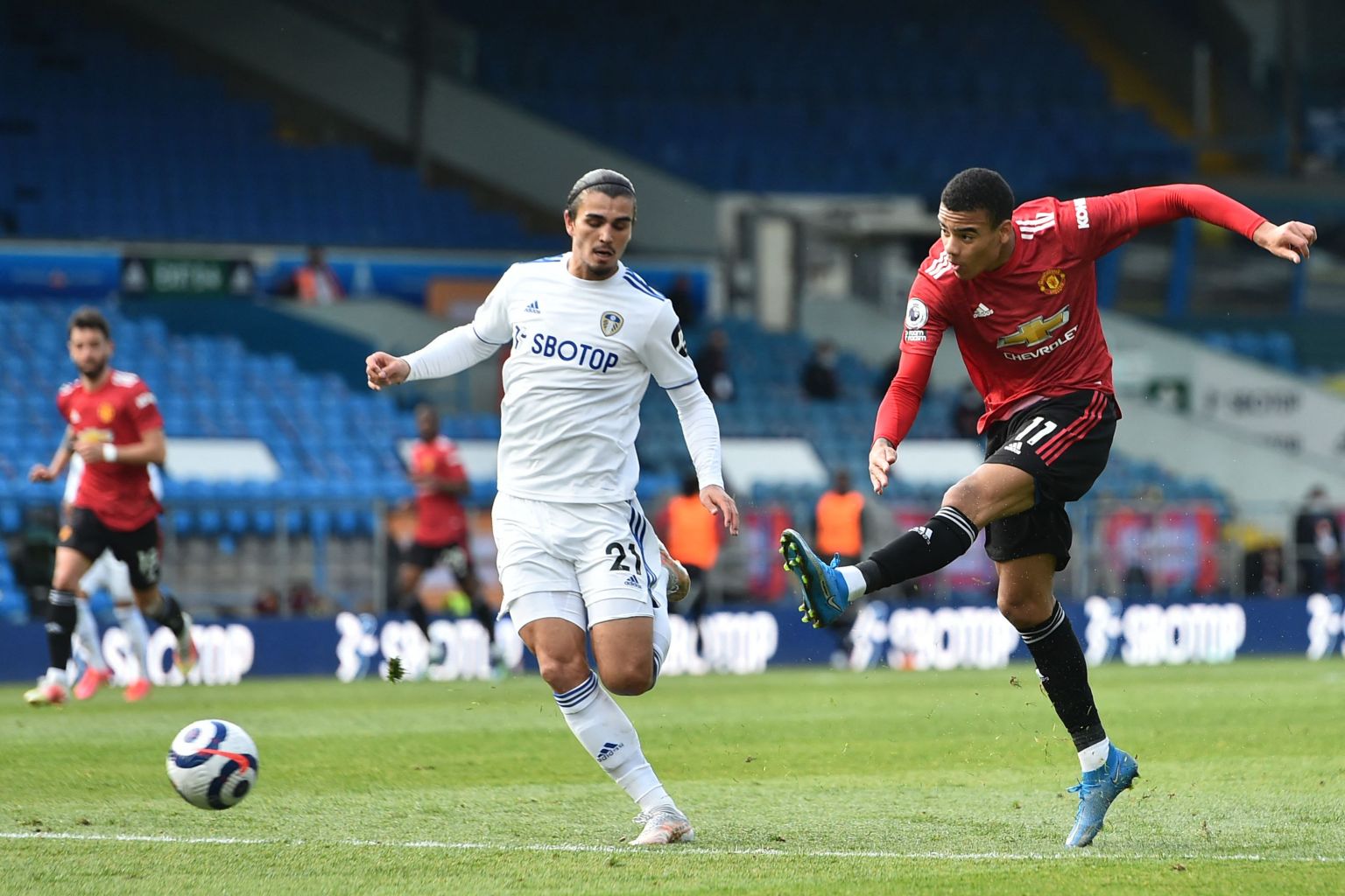 Manchester United's Mason Greenwood (right) shoots at goal during the match against Leeds United on April 25, 2021.