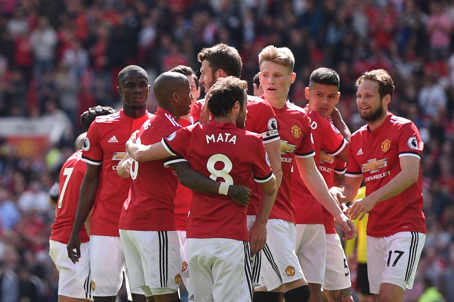 Manchester United players celebrating a goal from Marcus Rashford.