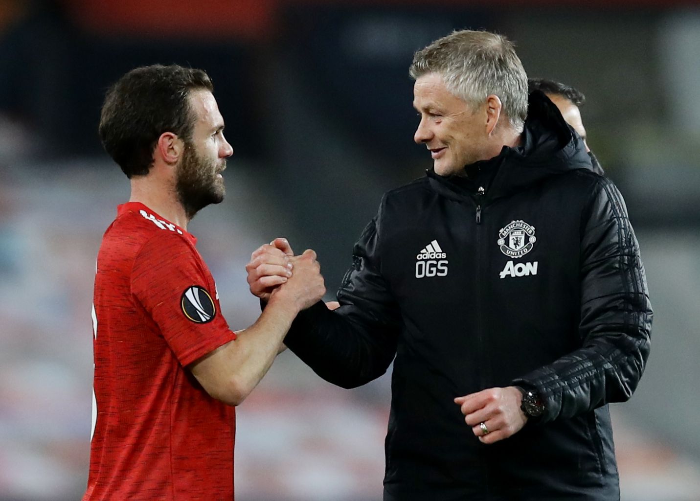 Solskjaer with United's Juan Mata after the team's Europa League match against Granada.