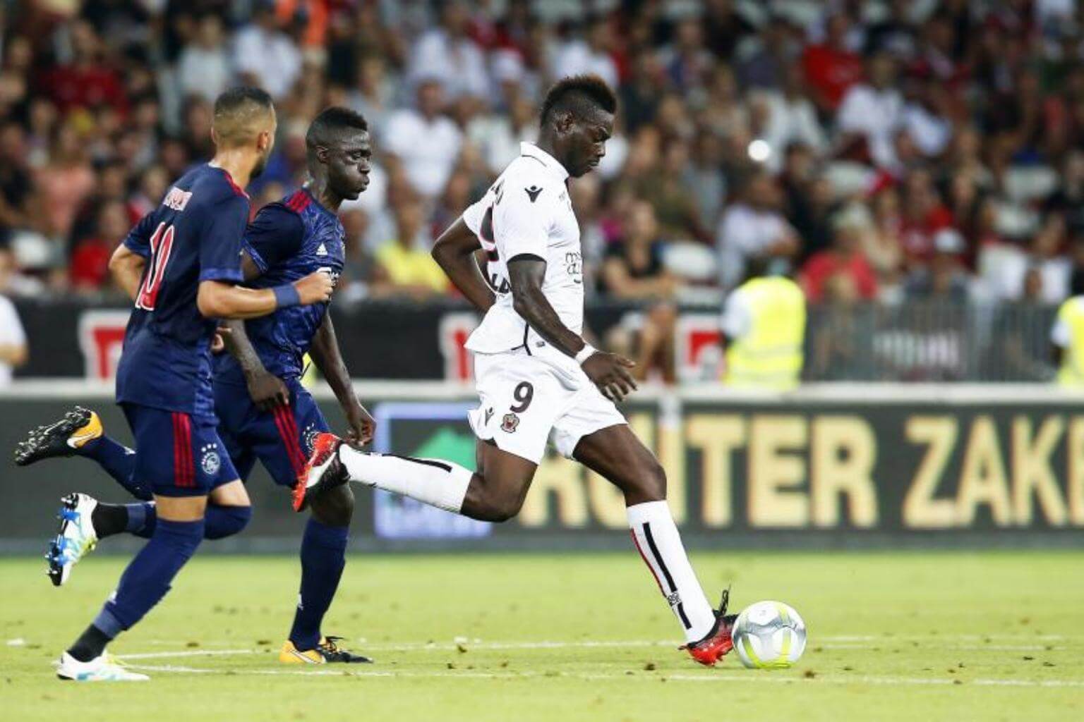 Nice's Mario Balotelli (right) in action during the UEFA Champions League third qualifying round, first leg soccer match between OGC Nice and Ajax Amsterdam in Nice, France on July 26, 2017.