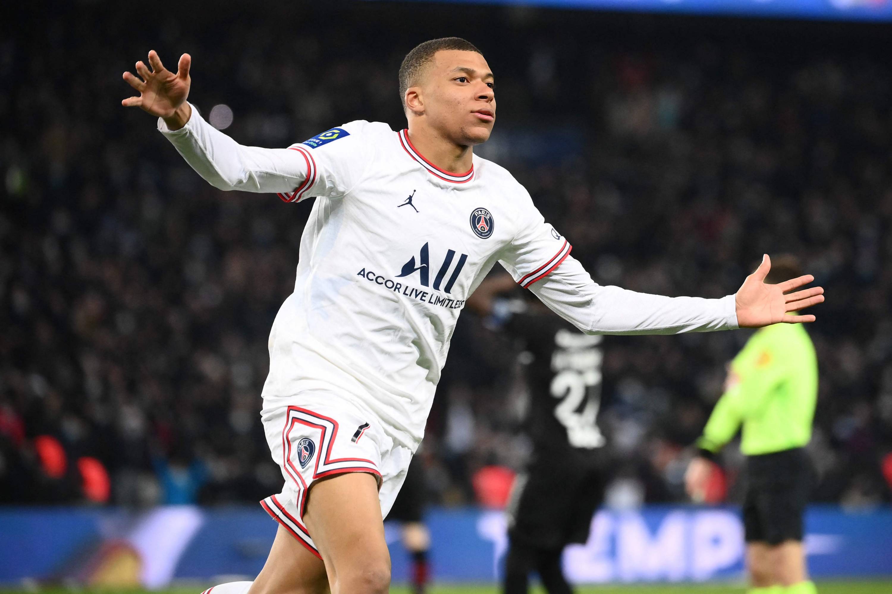 Paris Saint-Germain's forward Kylian Mbappe celebrates during the match against Stade Rennais on Feb 11, 2022.