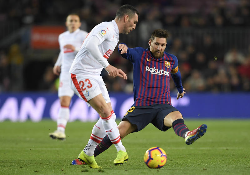 Eibar's Spanish defender Anaitz Arbilla (left) vies with Barcelona's Argentinian forward Lionel Messi during the Spanish League football match between FC Barcelona and SD Eibar at the Camp Nou stadium in Barcelona, on Jan 13, 2019.