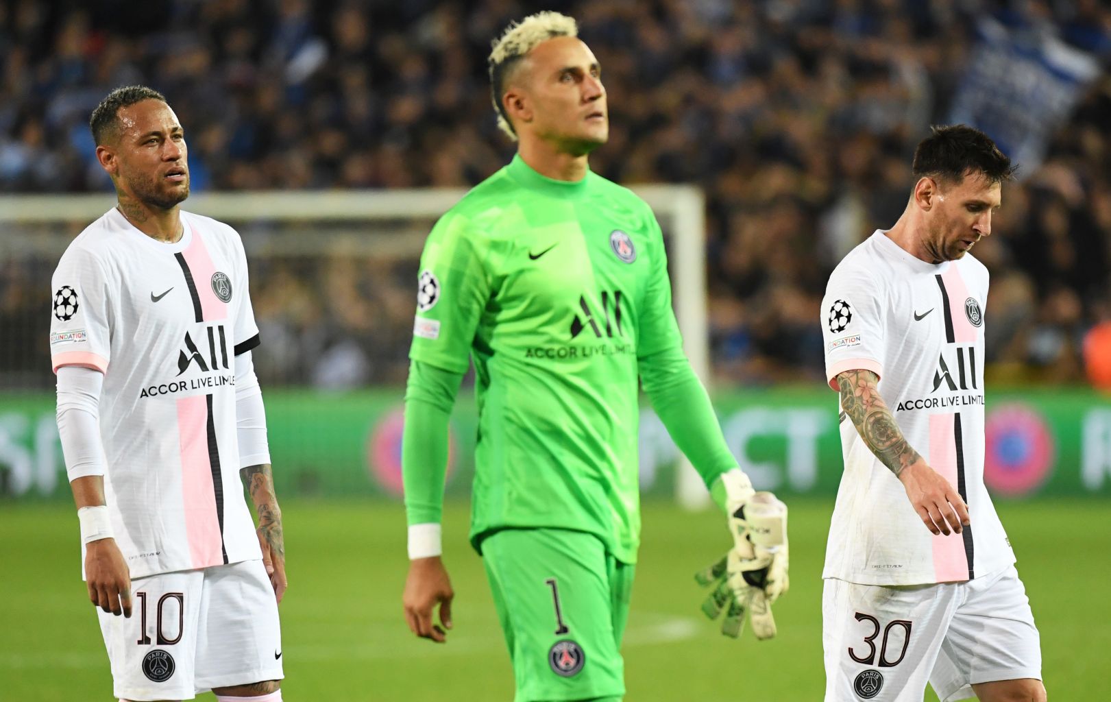 Paris St Germain's Lionel Messi, Neymar and Keylor Navas look dejected after the match.