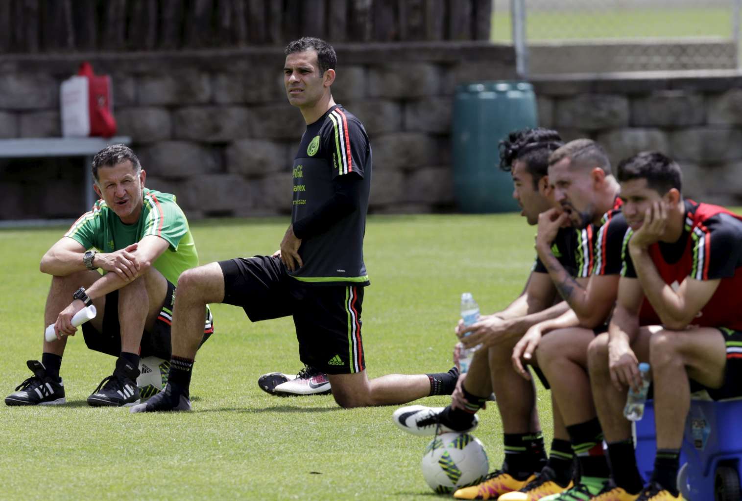 Mexico's national soccer team head coach Juan Carlos Osorio (left) talks with his player Rafael Marquez (2nd left) next to other teammates during a training session in preparation for their qualifying match against Canada.