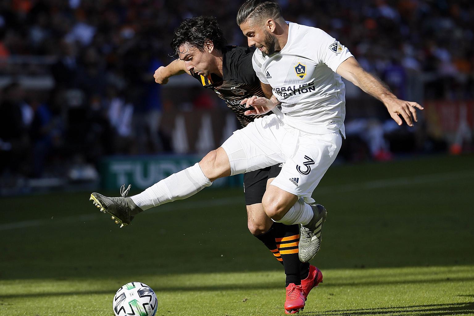 Zarek Valentin (left) of Houston Dynamo and Emilano Insua of Los Angeles Galaxy battling for the ball during their MLS match on Feb 29, 2020.