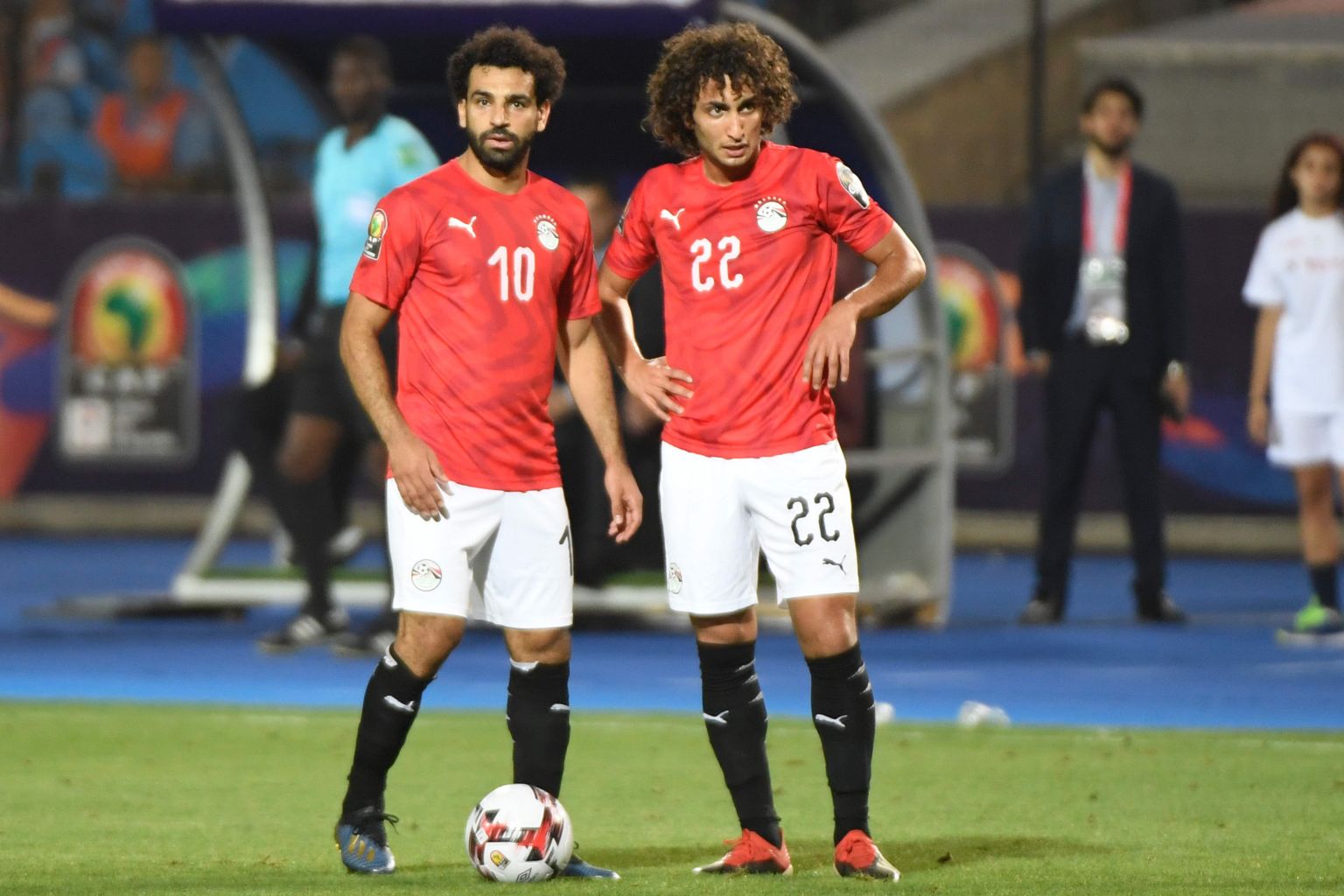 Egypt's forward Mohamed Salah (left) and midfielder Amr Warda during a 2019 Africa Cup of Nations match.