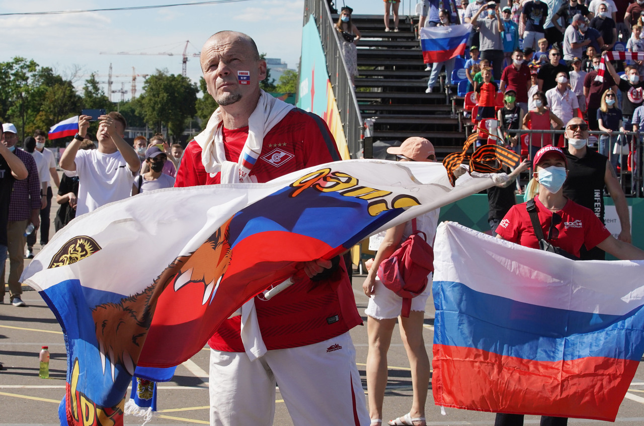 Russian football fans watching the Euro match between Russia and Finland at a fan park in Moscow on June 16, 2021.