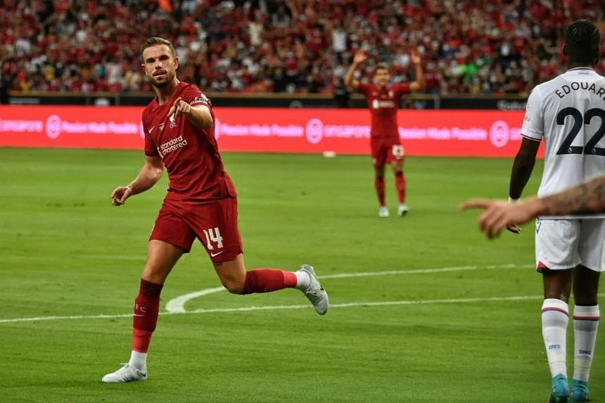 Liverpool players celebrating the first goal of the match against Crystal Palace during the Standard Chartered Singapore Trophy 2022.