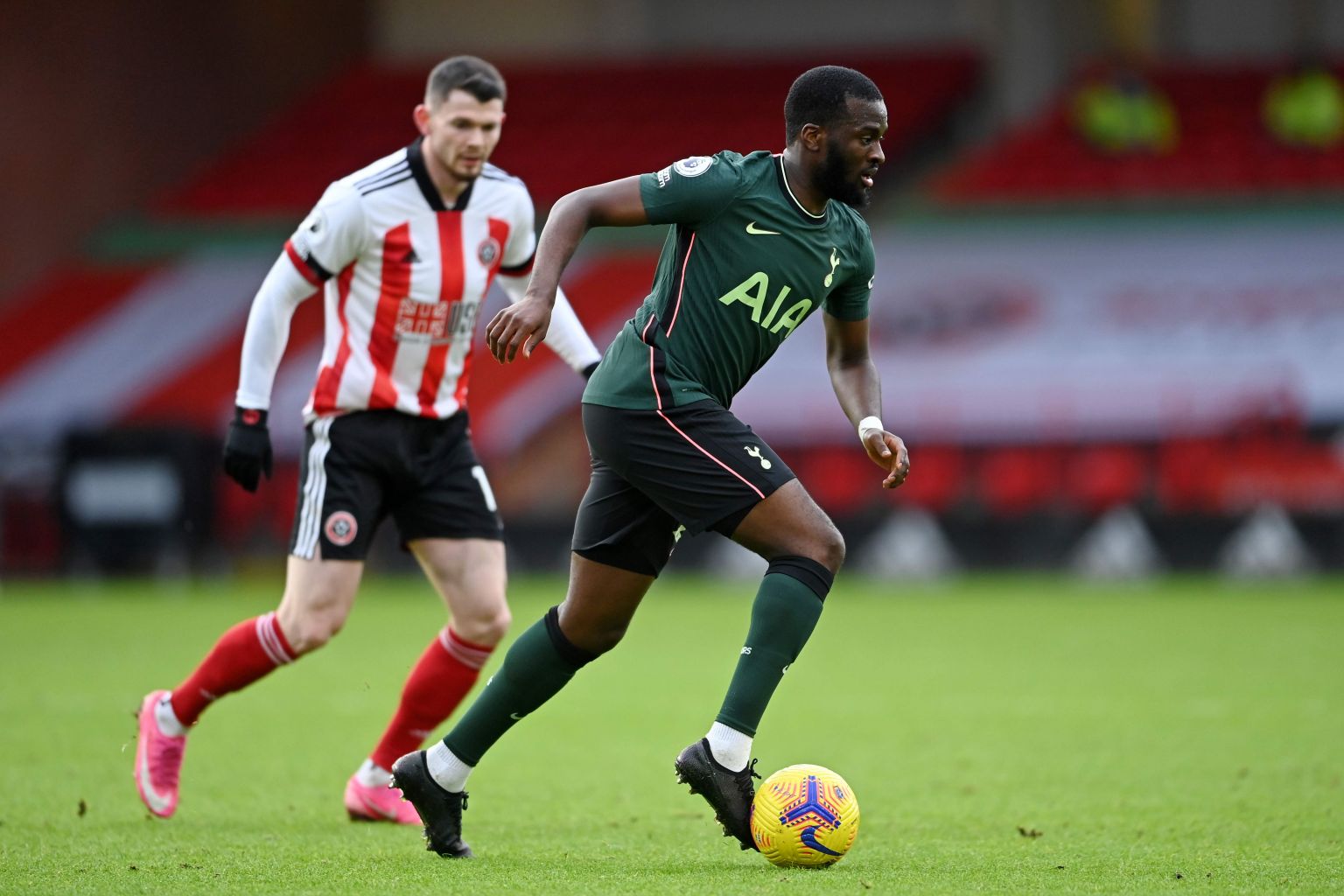 Tottenham Hotspur's Tanguy Ndombele in action with Sheffield United's Oliver Burke at Bramall Lane in Sheffield, on Jan 17, 2021.