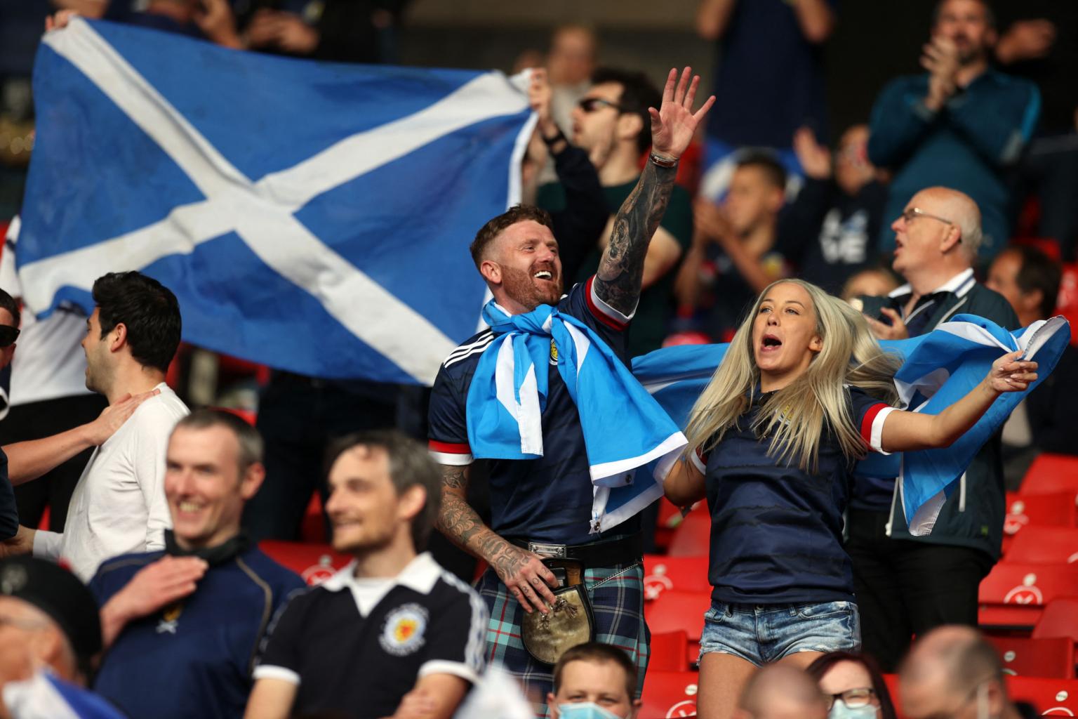Scotland supporters cheer ahead of the Euro 2020 match against Croatia at Hampden Park in Glasgow on June 22, 2021.