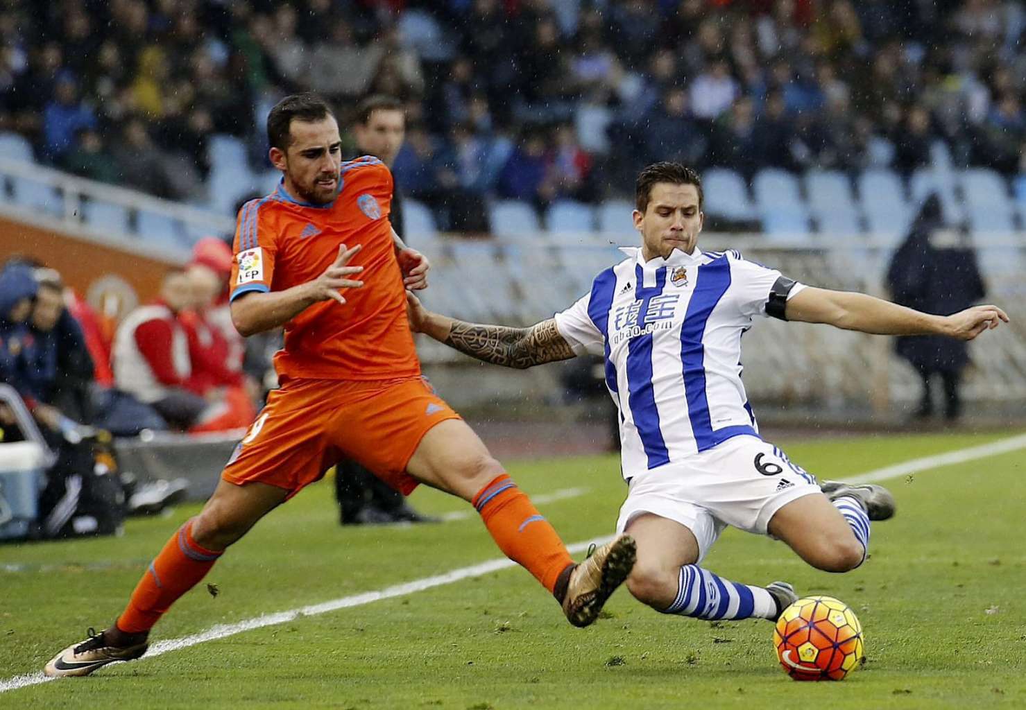 Real Sociedad's defender Inigo Martinez (right) duels for the ball with Valencia CF's striker Paco Alcacer during the Spanish Liga Primera Divison soccer match played at Anoeta stadium, in San Sebastian, northern Spain, on Jan 10, 2016.