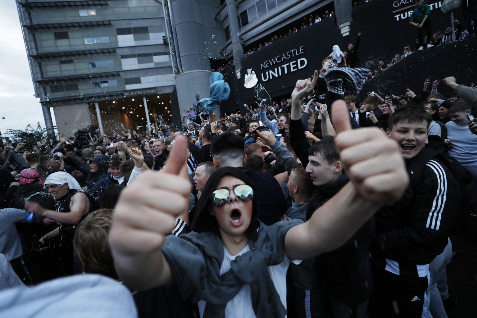 Fans react outside St James' Park after Newcastle United announced the Saudi-led takeover.