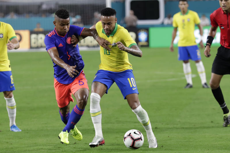 Colombia midfielder Wílmar Barrios and Brazil forward Neymar go for the ball on Sept 6, 2019.