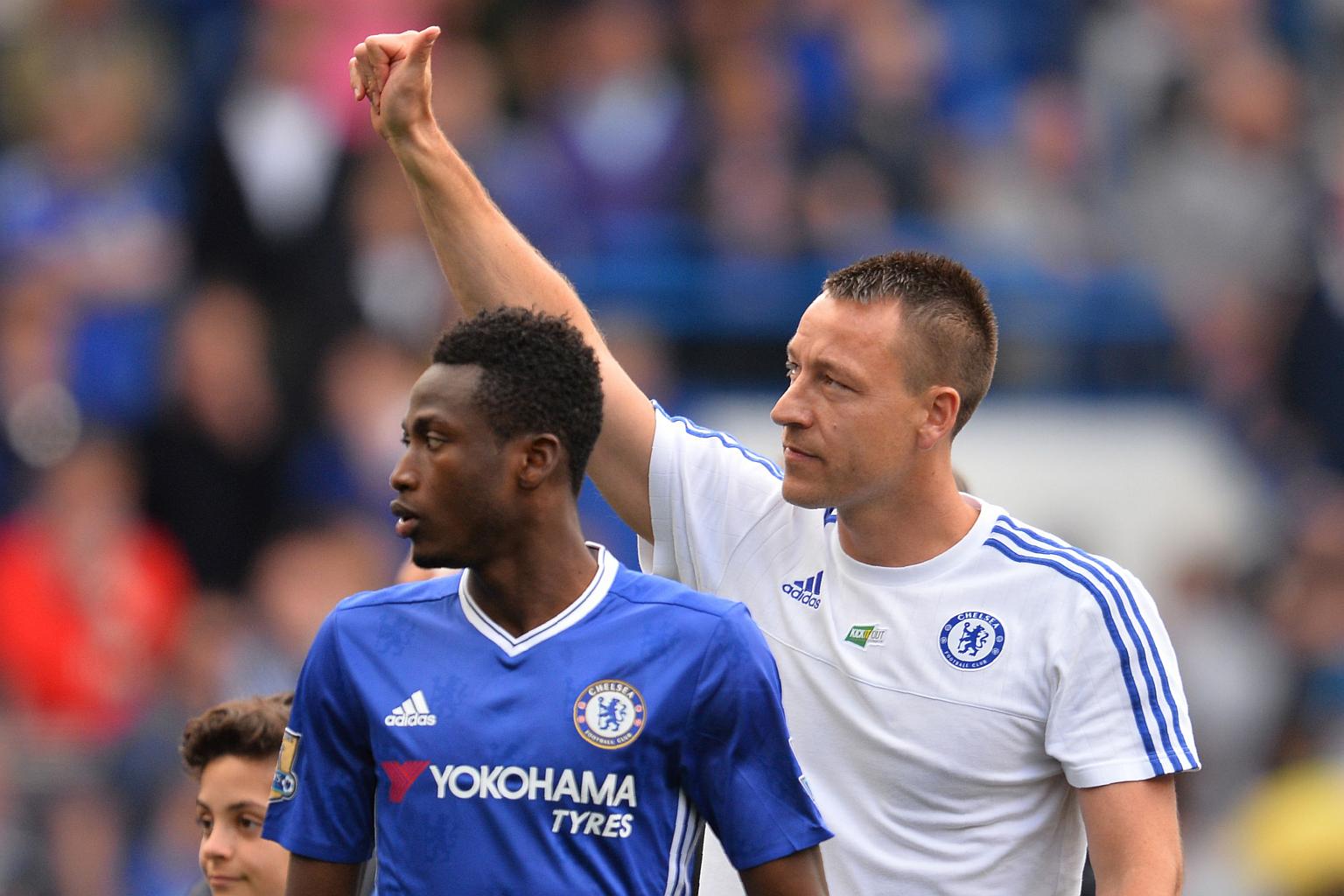 Chelsea's English defender John Terry (right) giving a thumbs up after the English Premier League football match between Chelsea and Leicester City on May 15, 2016. Chelsea and Nike have agreed to the second-biggest apparel deal in English soccer.
