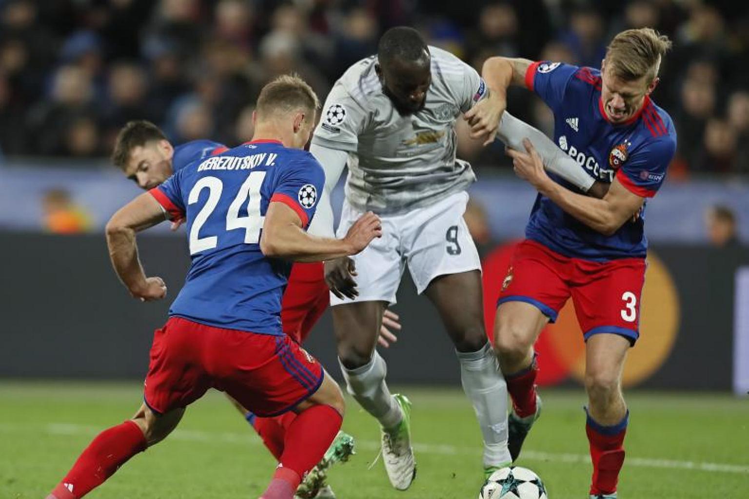 Vasili Berezutski (left) and Pontus Wernbloom of CSKA Moscow in action against Romelu Lukaku of Manchester United during the Uefa Champions League Group A match at VEB Arena in Moscow, Russia on Sept 27, 2017.