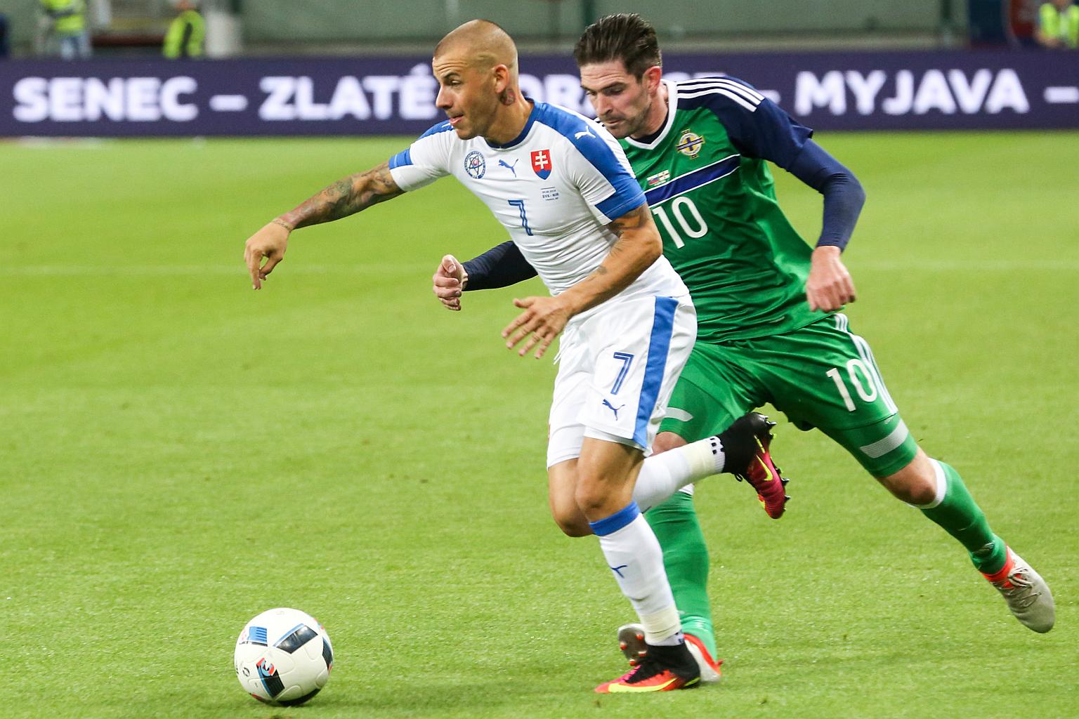 Slovakia's Vladimir Weiss (left) and Northern Ireland's Kyle Lafferty (right) vie for a ball during the a UEFA EURO 2016 friendly football match in Trnava, on June 4.