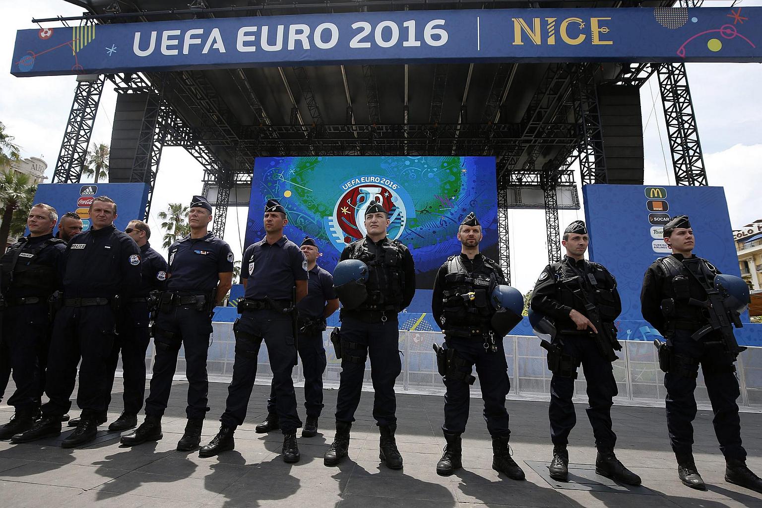 French police take part in a tour of security measures at the Uefa Euro 2016 Fan Zone, in Nice, France.