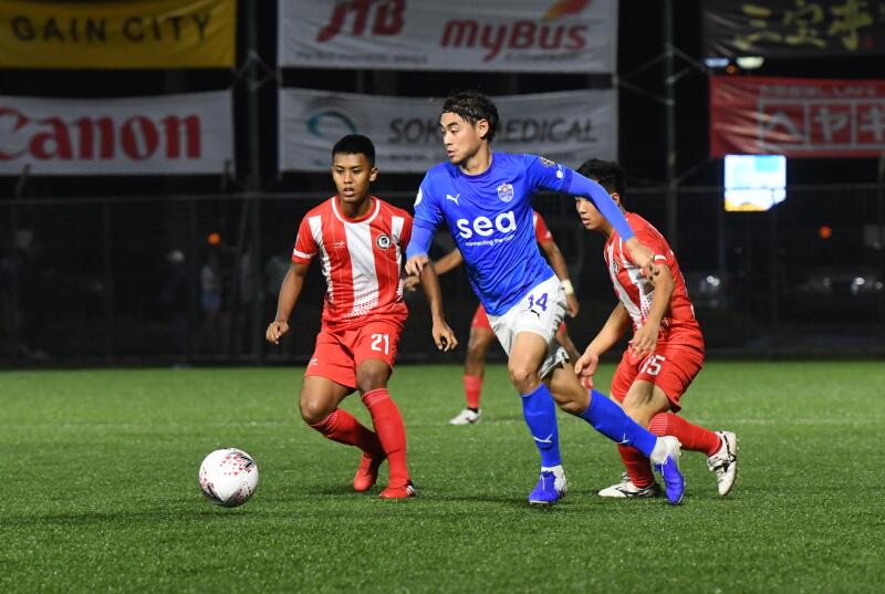 Lion City Sailors Gabriel Quak evading the challenge of Tanjong Pagar United's Suhairi Sabri (left) and Shodai Nishikawa in their draw on March 6, 2020.