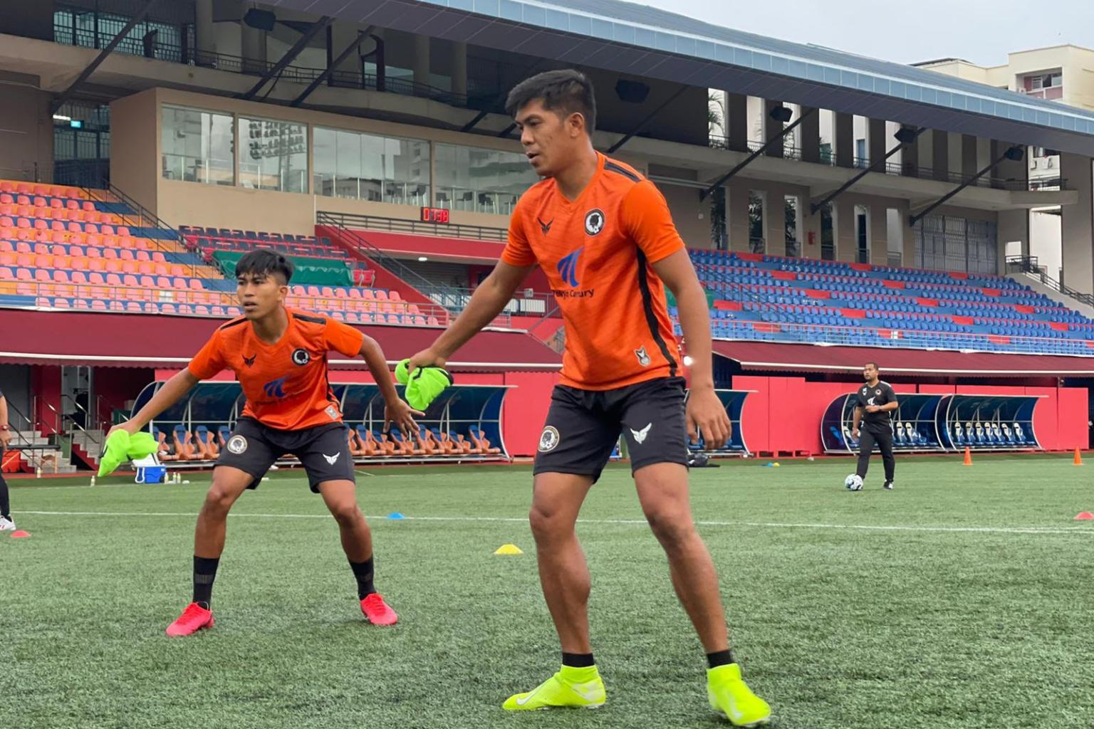 Tanjong Pagar United's Farihin Farkhan (left) and Khairul Amri in training.