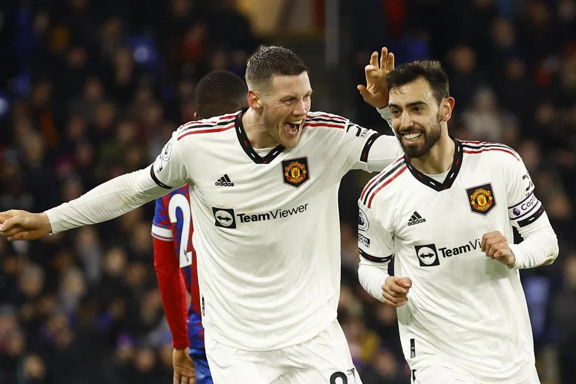 Bruno Fernandes (right) celebrates scoring for Manchester United with teammate Wout Weghorst.
