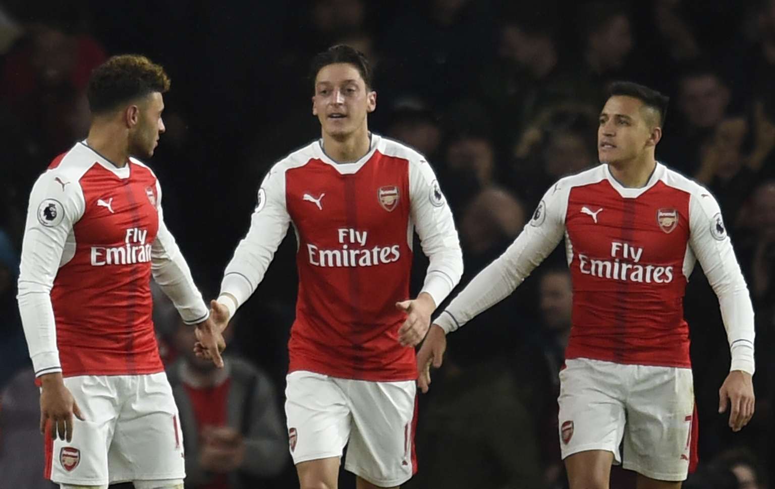 Arsenal's Mesut Ozil celebrates scoring their second goal with Alexis Sanchez and Alex Oxlade-Chamberlain.