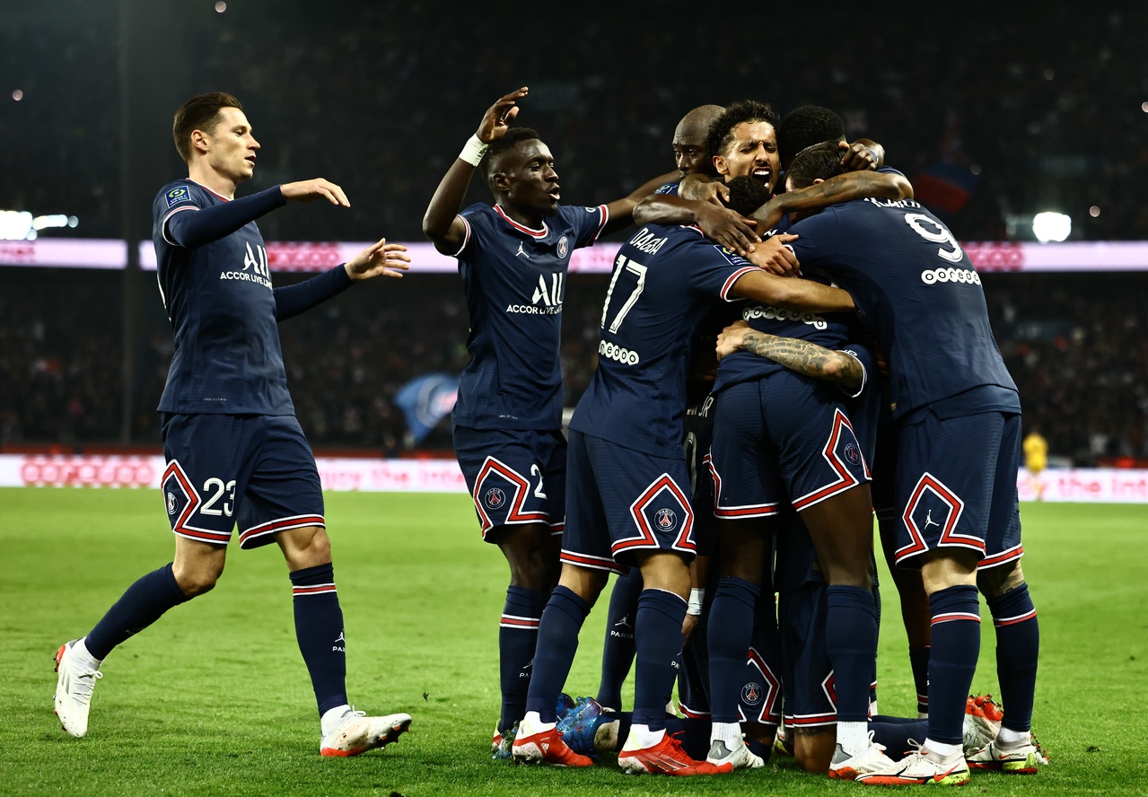 Paris St Germain players celebrate after scoring a goal during a match against Lille in Paris on Oct 29, 2021.