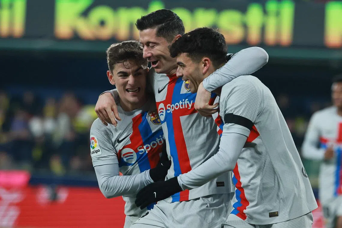 Barcelona’s Pedri (right) celebrates with teammates Gavi (left) and Robert Lewandowski after scoring his team’s first goal against Villarreal.